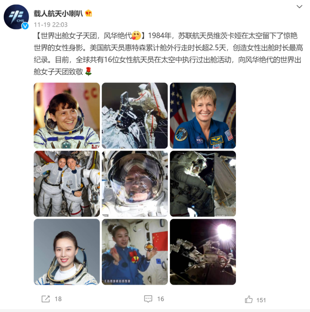 其中,包括王亚平在内,只有16名女性航天员进行过舱外行走。