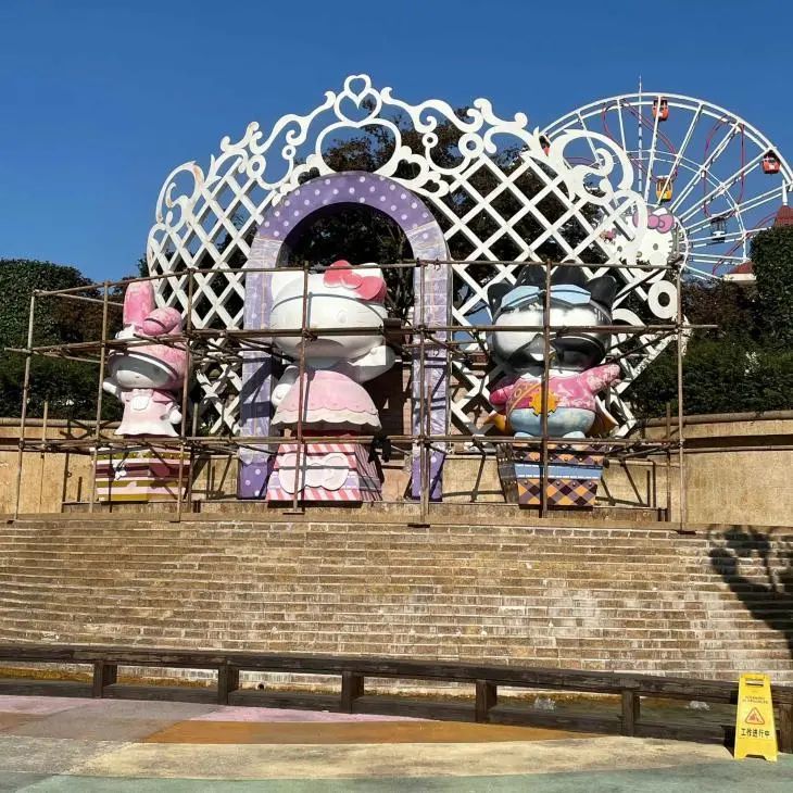“维修翻新的架子大摇大摆搭在外面,需要黑暗的项目里也开着灯维修。路上到处是晒旧的建筑和吹破的旗帜。大部分商店项目都没开放。努力表演的IP角色身上脏兮兮的,助理甚至不清楚会不会定期清理…”今年11月11日,IP粉saiu如此在微博评价杭州Hello Kitty主题乐园园区。