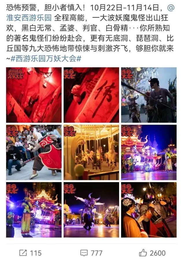 典型如同淮安的西游主题乐园,这座今年7月开业的主题乐园是国内落成的第一座西游主题乐园。随着今年环球影城开业,国内掀起关于本土仙侠文化IP打造主题乐园的探讨,淮安的西游主题乐园获得了不少关注。淮安西游乐园也趁势将营销做满,不仅在微博、小红书等渠道打出不少广告,也联动大量短视频网红,在万圣节节点前后打造了“西游万妖节”,可谓在传播上不遗余力。