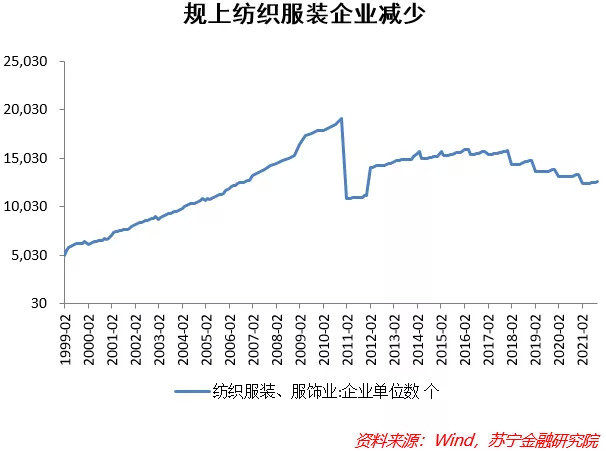 纺织服装在产业转移升级、行业景气度下降的过程中,市场集中度趋于集中。规上纺织服装类工业企业数量在长期中持续减少。但这并不意味着行业内企业的竞争程度减小,相反总体看,尤其是上游的纺织行业作为低端制造业行业内部竞争还会进一步加剧,中小企业还将在激烈竞争中退出或转型。