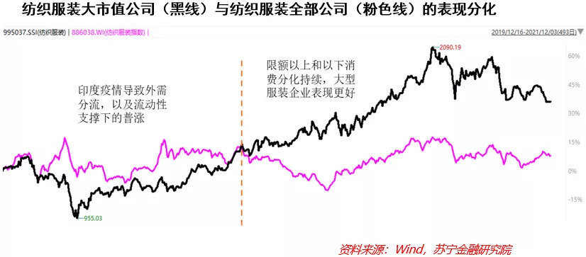 类似于疫情以来宏观上的限额以下消费不如限额以上消费的现象,大型上市服装企业的表现在疫情之后也明显好于中小型纺织服装企业。