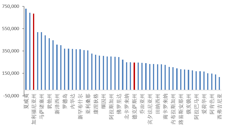 2019和2020年得州的新增人口均位列全美第一,分别为36万和37万,相比之下加州的人口和就业增长均呈现放缓态势,2020年加州人口减少近7万。