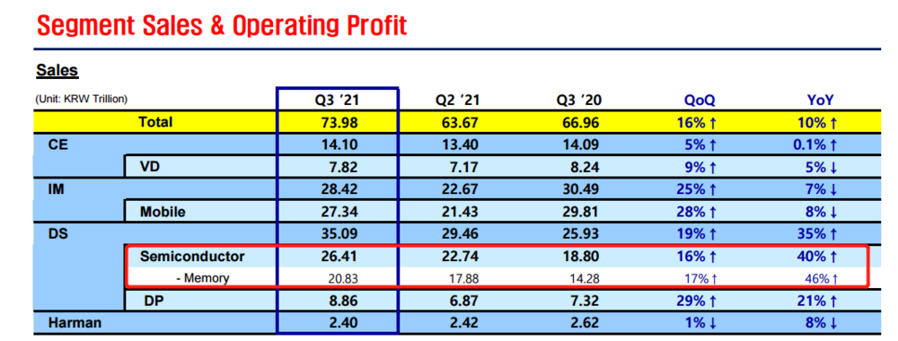 在设备解决方案中,半导体业务是主要的贡献者,第三季度营收达到26.41万亿韩元,同比增长40%。