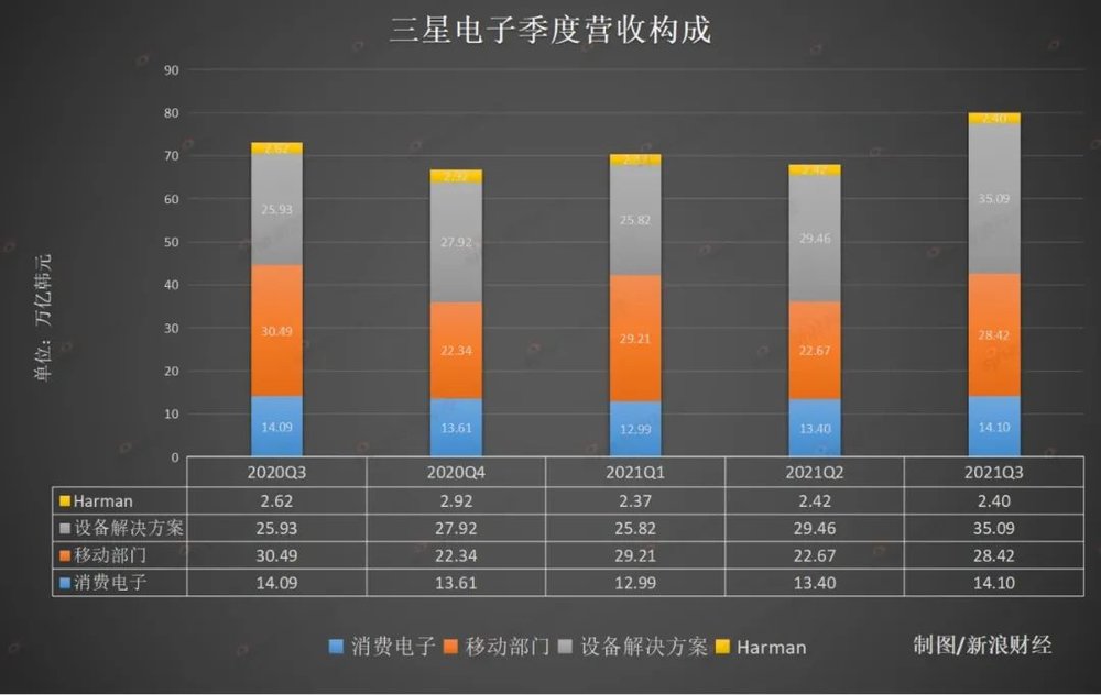 三星电子的设备解决方案业务正在成为新的增长动力。以今年第三季度财报为例,三星电子的设备解决方案部门营收为35.09万亿韩元,运营利润为11.58万亿韩元,在几大业务板块中贡献最大。与2020年第三季度相比,设备解决方案部门的营收实现了对移动业务的反超。