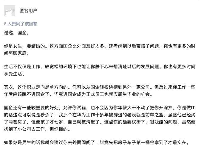 持这样观点的人不在少数,知乎一个问题“本人女,tplink和长沙国企offer选择?”,最高赞的回答是建议国企,“如果男生就建议去外面闯闯”。