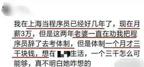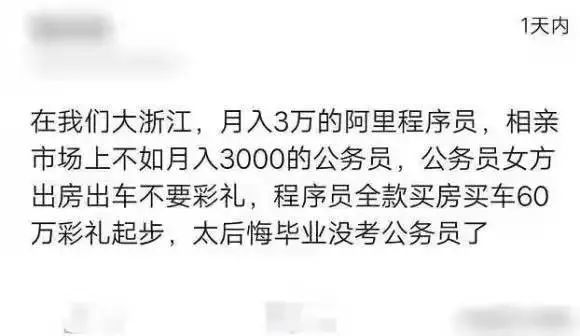 这厢说“男的闭眼选大厂就好”,那厢却看到遵循该原则的“过来人”倒苦水,明明是个未婚程序员,月入3万,背靠大厂,却发现自己不是黄金单身汉,在当地的婚恋市场打不过工作稳定的公务员;明明是个已婚程序员,却被老婆一直劝说去考公。