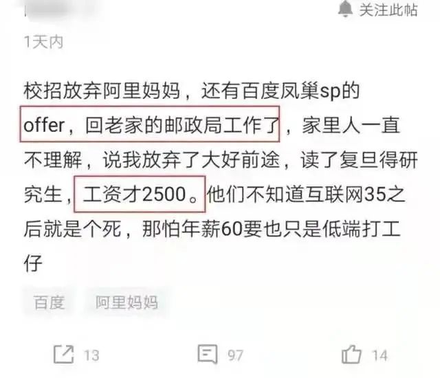 即便在人均年薪百万的脉脉,2020年也曾出现热帖“复旦硕士放弃阿里、百度等大厂的offer,选择邮局2500月薪”。发帖人认为“互联网35岁之后就是个死,哪怕年薪60万也只是低端打工仔”虽然听起来极端,却代表了打工人对在互联网行业事业发展的普遍担忧。