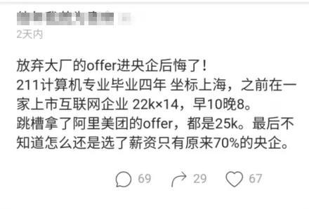 但己之蜜糖,彼之砒霜。降薪从大厂转到央企的人,后悔自己不该早早“追求安稳”。一位网友自称是211计算机专业毕业,之前在一家上市互联网企业月入2万,跳槽时拿到了美团月薪2.5万offer,但最后还是选择了央企。这个选择却令他十分后悔:下班太早无所事事,没有了前进的动力。