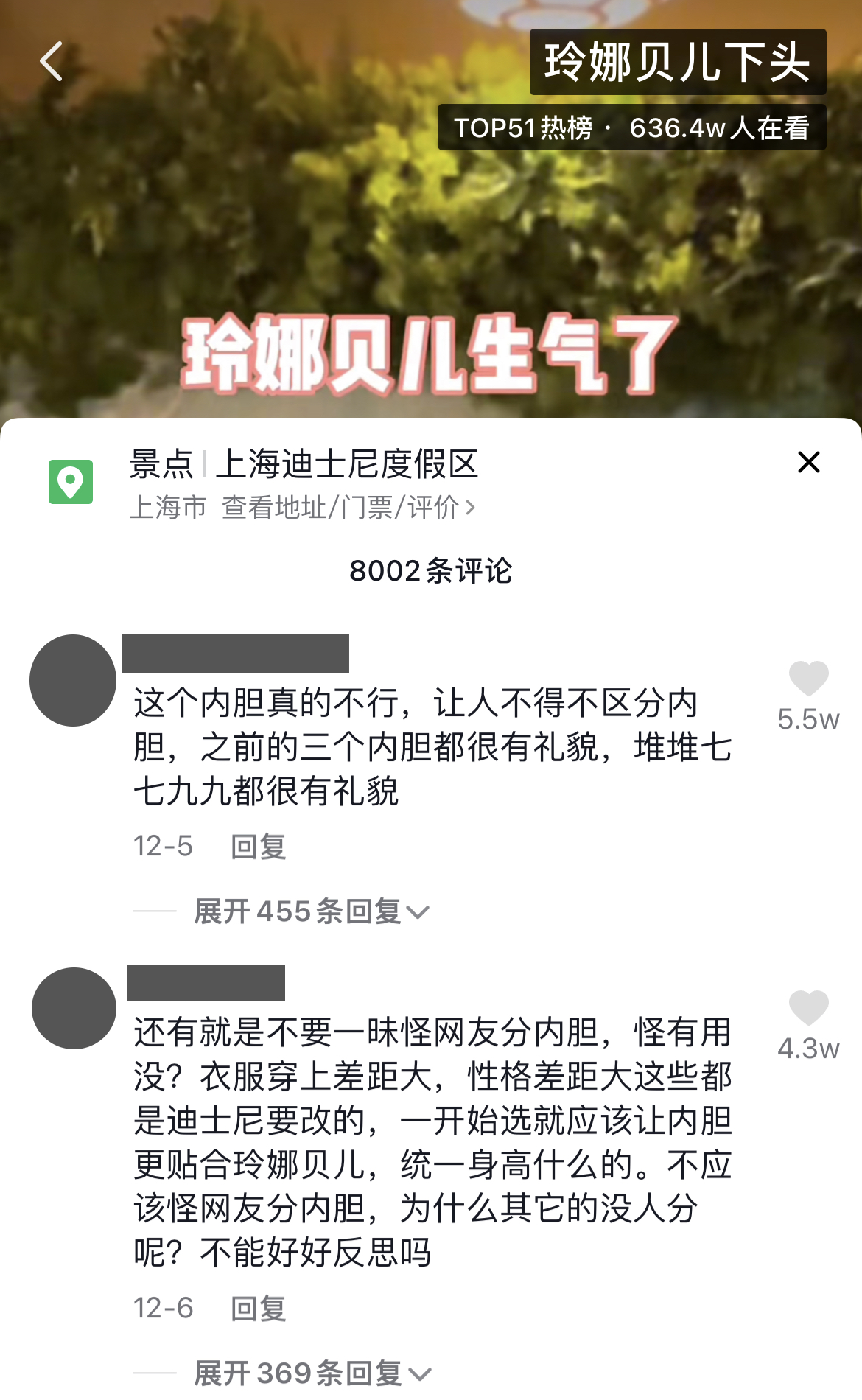 事情进行到这里才开始变得有趣了。在玲娜贝儿翻车视频的评论区下面,大家吵得不可开交:有人说这是“内胆”(玩偶服装里的演员)表现太差,此行为与玲娜贝儿本人无关,建议迪士尼赶紧开除这个不敬业的“内胆”,规范自己的品牌形象。