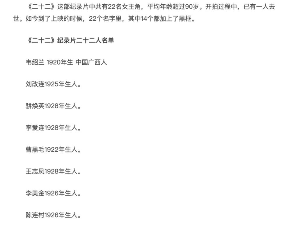 过了三年,2017年的时候,导演又拍了一部纪录片,取名叫《二十二》:
