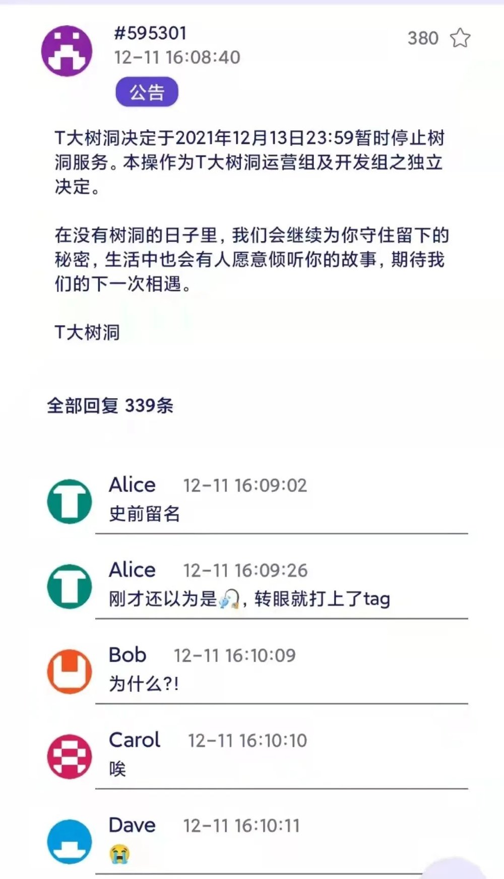 可这样的乐观很快就落空了。一个星期后,他给我发来消息,学校今天来约谈,树洞又被关闭了。我连忙点开树洞,看到了那条置顶的帖子——