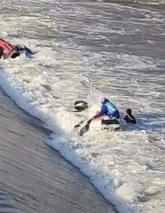 武海义和队友乘坐的冲锋舟被卷入水流。来源:视频截图