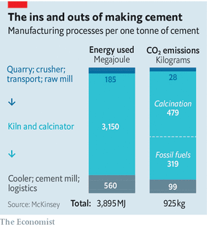 生产一吨水泥需要的电量和二氧化碳排放量 ©️The Economist