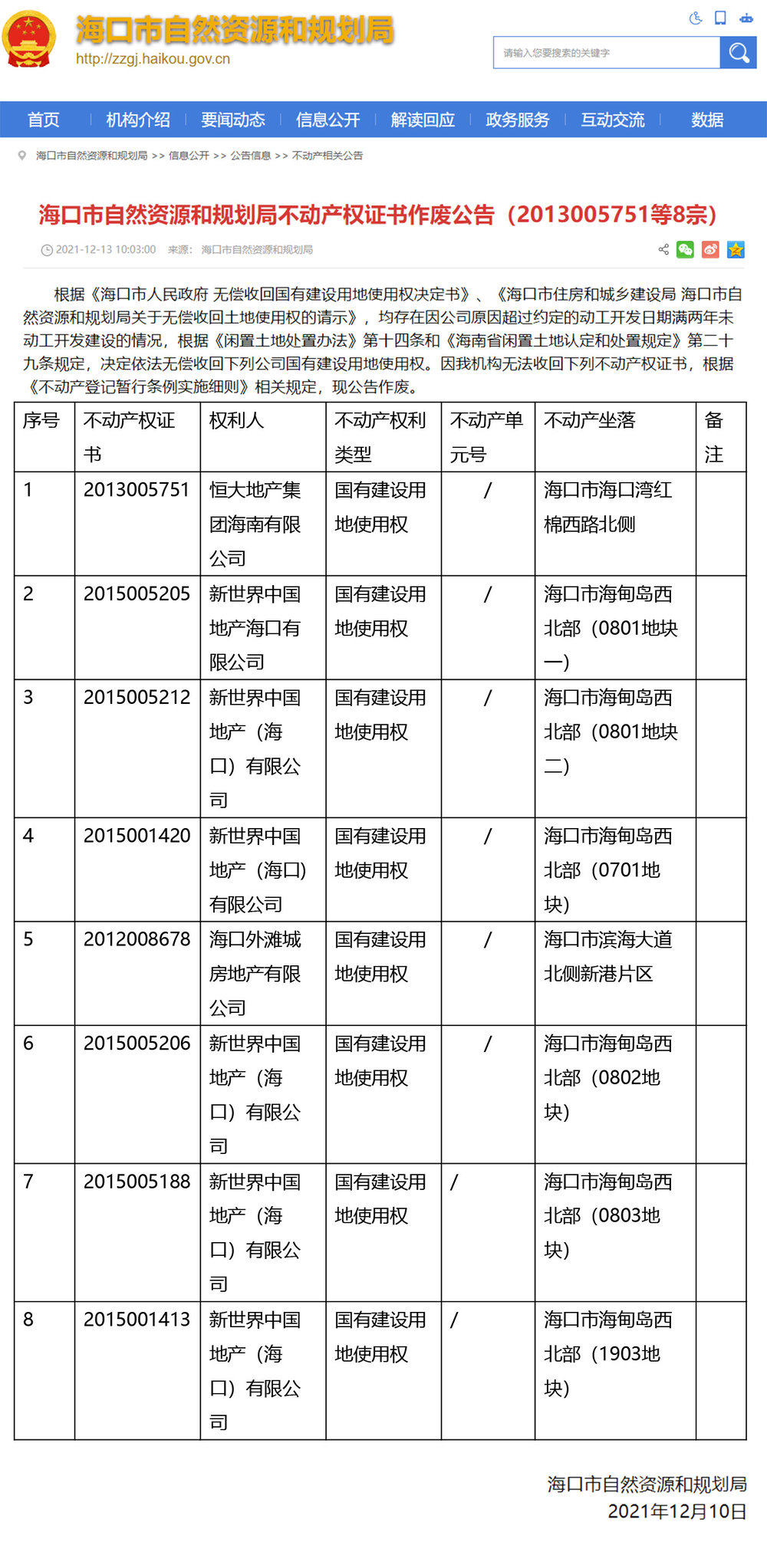 12月14日,据澎湃新闻报道,从海南省海口市自然资源和规划局获悉,恒大地产集团海南有限公司位于海口市的8宗地块被海口市人民政府无偿收回。