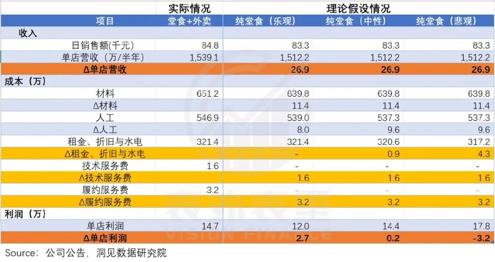 1. 纯堂食只有收入数据,其成本变动需要根据外卖成本参数假设不同,进行推演。