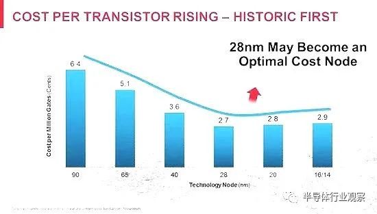 事实上从图2就可以看出,在28nm以后,平摊到单个晶体管上的价格其实就没有下降,反而在不断的上升。这其实已经在经济上宣告了摩尔定律的终结——我们确实还是可以买到包含了越来越多晶体管的芯片,但是那种等2年左右时间就可以用同样的价格买到比原来多一倍晶体管芯片的“理想年代”已经一去不返了。