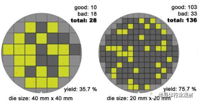 图3.裸芯面积越小整体良率越高