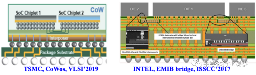 首先是封装技术,Chiplet技术要把原本单个大硅片“切”成多个再从封装级组装起来。单个硅片上的布线密度和信号传输质量是要远远高于Chiplet之间的。这就要求必须要发展出高密度、大带宽布线的“先进封装技术”,尽可能的提升在多个Chiplet之间布线的数量并提升信号传输质量。好消息是经过多年的发展,Intel和台积电(TSMC)都已经有了相关的技术储备,通过所谓的中介层(Interposer)将多个Chiplet互连起来。TSMC公布的技术是CoW,而Intel公布的是EMIB。今天这些技术仍然在不断演进中,并有更新的技术不断推出。