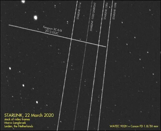 图 | 四颗星链卫星:Starlink-1114(2020-001P)、Starlink-1030(2020-001N)、Starlink-1084(2020-001B)和Starlink-1098(2020-001D)。其中 Starlink 1030 经过表面涂色,相比之下亮度有所降低 来自:SatTrackCam Leiden