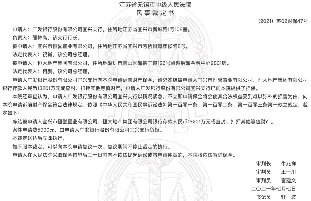 裁定书显示,广东发展银行宜兴支行对中国恒大集团有限公司及旗下一家项目公司申请诉前财产保全,冻结其存款共计1.32亿元,或查封、扣押其他等值财产。