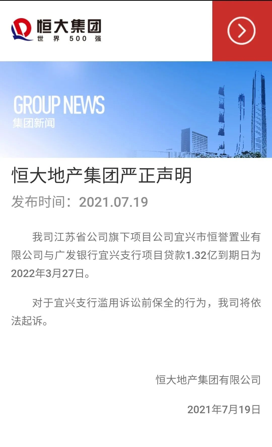 为了防止多米诺骨牌效应,恒大迅速反击。在裁定书下达当天,恒大集团公开声明其旗下公司与广发宜兴支行的贷款项目到期日期为2022年3月27日,并称要反诉广发宜兴支行滥用诉前财产保全权利。