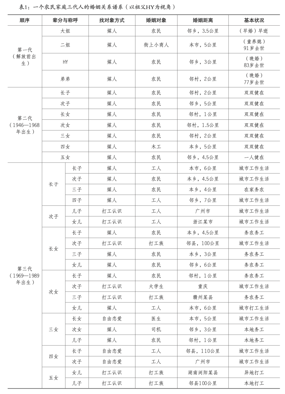 本文基于一个家庭三代人的婚姻关系谱系的历史考察(见表1),透视新中国70年一个普通的农民家庭的婚姻圈与家庭关系变迁过程,从微观角度探讨跨地区的异地婚姻带来的农民家庭内部的融入与整合问题,分析异地婚姻带来的新挑战及其因应之策。