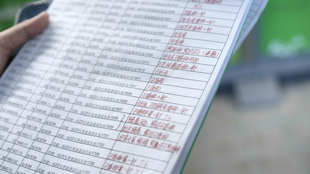 欧梦婕像是这里的一份子一样,每一个见到她的人会跟她唠嗑两句,从进门时保安的那一句,“又上门走访啊!”开始。敲门,开门,询问,敲门,开门,询问……不断重复相同的动作,不同的话语,阿姨,你好,请问你接种疫苗了吗?阿伯,你好,请问您降压药吃了没?你好,你家小孩上学要用的居民信息登记表确认了吗?……问完了,在表格最后一栏的备注里登记,以确保知道每一个人的情况。