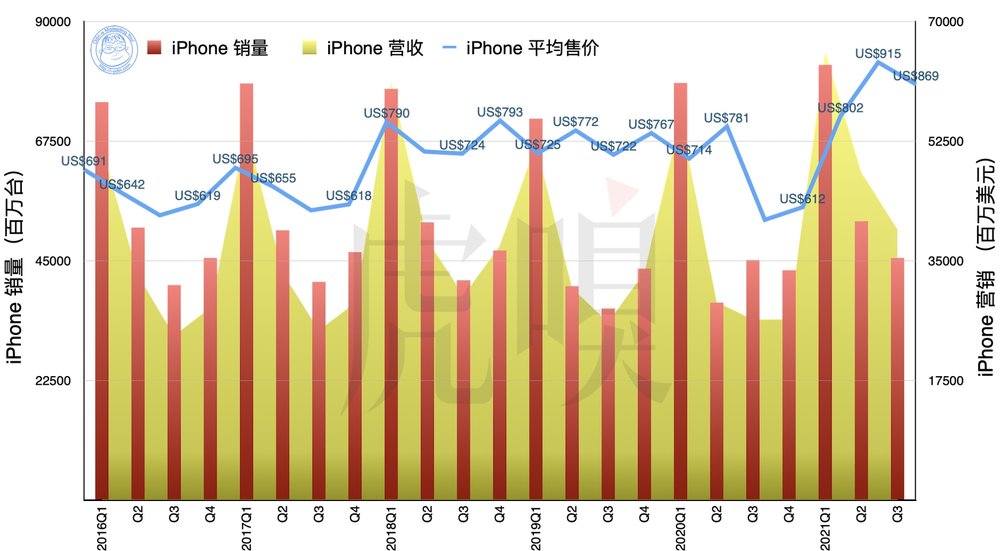 由于苹果在 2019 以后也没有再公开 iPhone 的销量数据,加上在截稿之前,包括 IDC 等几家主要的统计机构,也没有释出相关的销量数据。所以 Odin 只能通过先前 Canayls 估算的 1% 增幅来计算,得出以下数据,发现关键仍然是 iPhone 的平均价格:如果 iPhone 销量真的仅增加 1%(上图红色条),但营收却比去年同期暴增 50%(上图黄色区域),其平均售价定必大幅激增(上图蓝线)。
