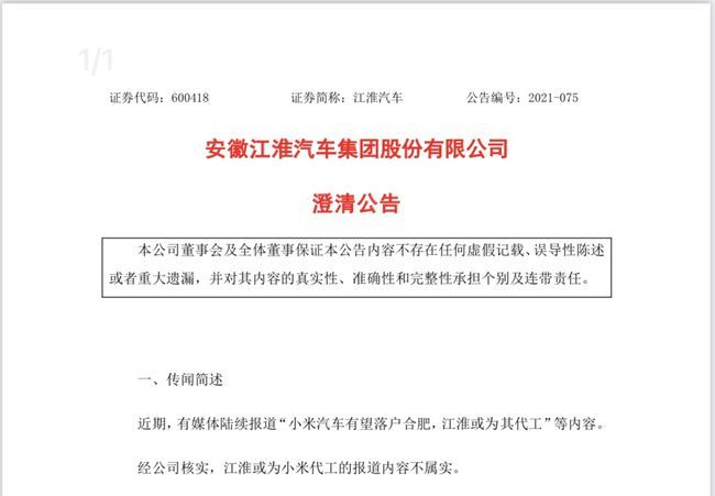 @澎湃新闻【江淮汽车公告:江淮或为小米代工的报道内容不属实】7月29日,江淮汽车发布澄清公告称:近期,有媒体陆续报道“小米汽车有望落户合肥,江淮或为其代工”等内容。经公司核实,江淮或为小米代工的报道内容不属实。截至目前,公司未与小米就合作造车进行过商议,也未达成任何合作造车的意向。