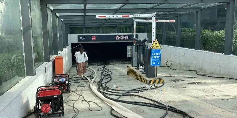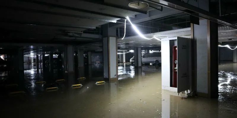 随后,记者跟随一位业主张宇(化名)到该小区地库查看情况,通往地下车库的楼梯上仍有大量湿滑的淤泥,在负二层,记者看到,仅有为数不多的几盏灯亮着,部分车辆还停在里面,其中不乏大量捷豹、路虎等豪车。物业公司的小型抽水设备还在地库入口和楼梯上持续向外抽水。由于负三层淤泥太多,沼气太重,记者一行便没有进入查看。