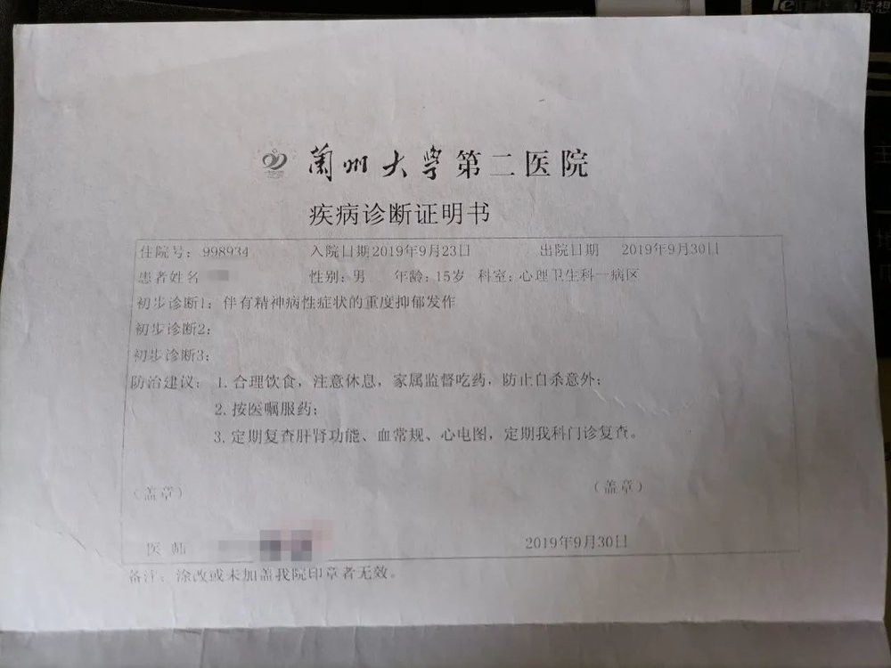 9月份时,李雪被诊断为“伴精神病性症状的重度抑郁发作”,出现幻觉,他怀疑自己被跟踪,有自杀想法。