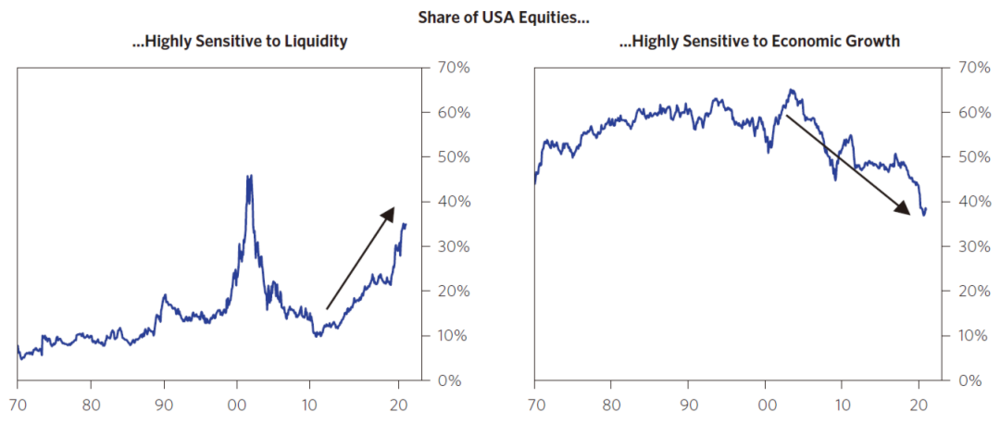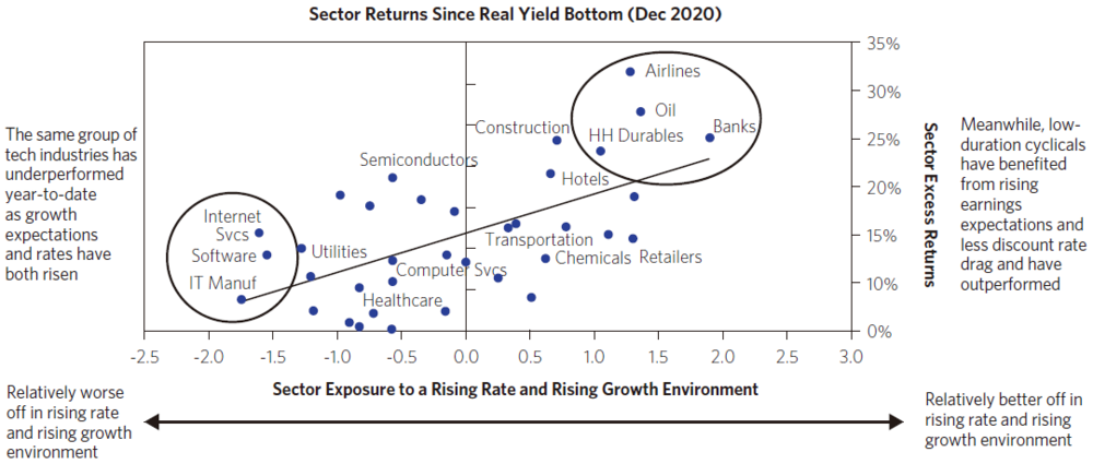 随着经济增长和流动性环境过去一年的变化,股市中的绩优股和落后股也不断变化。虽然在2020年大部分时间跑输市场,但受益于真实经济支出增长的股票在2021年表现强劲,而一些流动性敏感的公司(大部分是快速成长的、未盈利的公司)的股票在今年跑输市场。