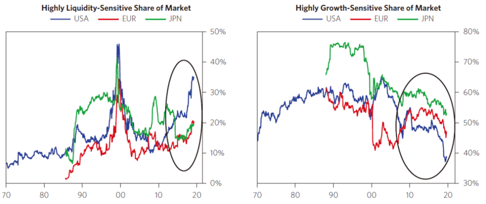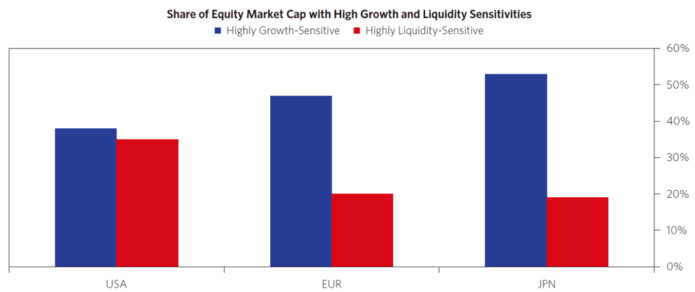 如下图所示,相较于美股市场,欧洲和日本的市场中增长敏感的企业占比更高,而流动性敏感的企业占比更低。