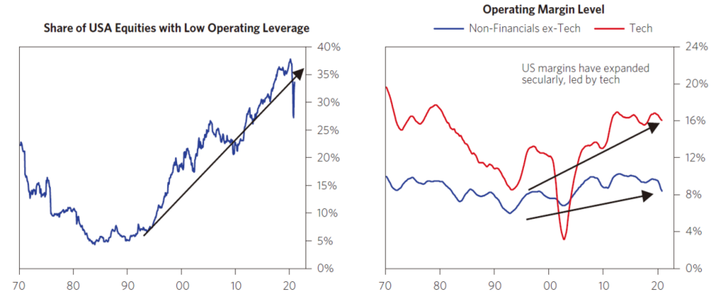 如下方左图所示,经过了30年利润率稳步增长,低运营杠杆的公司占据了三分之一的市值。利润增长很大程度上来自于科技公司;而这种现象既来自于科技公司的利润率大幅增长(如下方右图所示),也来自于高利润率的科技公司获得了更多市场份额。