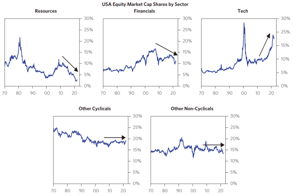 而且,如此企业收入增长受到经济增长的影响更少。过去10年,一些受名义增长影响重大的行业,如能源和金融行业,被科技公司抢去了很多市值。虽然科技公司的周期性强于一般企业,他们几乎不受到真实经济扩张和信贷增长的影响。