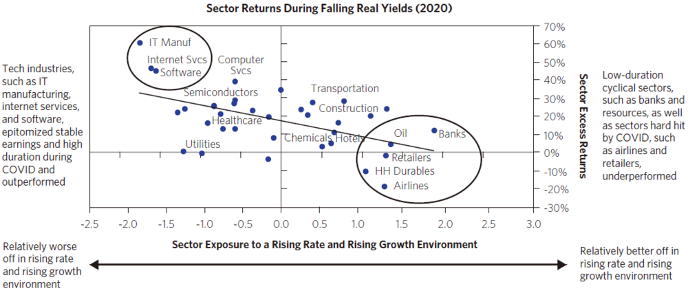 下图展示了在2020年利率下降时和2021年利率上行时,不同行业的股票表现。右半边的行业是受益于利率增长、经济增长的行业,在2020年的流动性扩张、经济增长放缓的环境下跑输市场,而左半边则完全相反。值得注意的是,经济增长和流动性因素结合的影响较比单一因素更强。