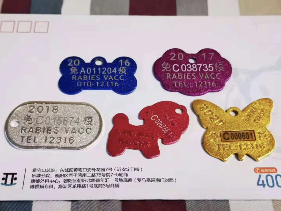 由于狗证归属公安部门管理,狗的防疫归属农业农村部门管理,有狗主人对我说,“免疫牌比狗证更能证明狗是安全的”,应该是免疫了再办证,“但现在的流程却是先办证,凭证可以打一针免费疫苗。那位狗主人向我展示了免疫牌,这是一种硬币大小的彩色小牌,每年的形状和颜色都不一样,今年是天坛,往年有狗骨头、蝴蝶形状。