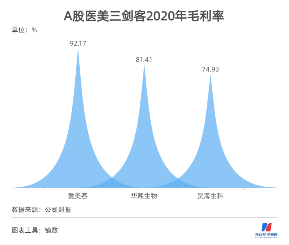 从爱美客的业绩表现来看,今年一季度实现营收2.59亿元,同比增长227.52%,实现归母净利润1.71亿元,同比增长296.50%。2018年至2020年,爱美客的营收复合增长率约47%,归母净利润复合增长率则达到75%。今年1季度,爱美客的毛利率高达92.5%,这一数字甚至将贵州茅台甩到了身后。