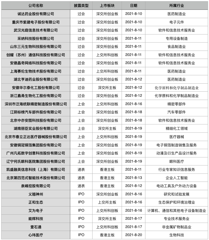 上周及本周(8月9日-8月20日)共计过会公司11家,上会(递表)公司11家,IPO公司6家。