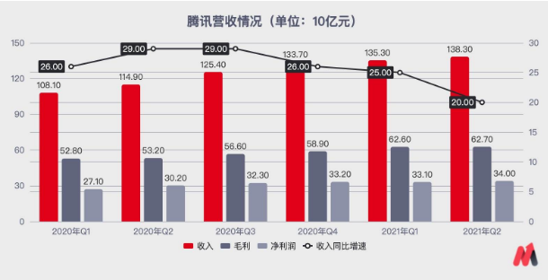 通常来说,即使是腾讯、阿里这样大体量的巨头,增速低于30%也应引起警惕,更何况腾讯近一年的营收同比增速不断下降至20%。