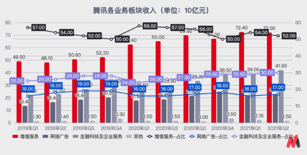 2021年Q2,腾讯仍有超一半(52%)的收入来自增值服务,同比增速11%(Q1为16%)。720亿的增值服务收入中,游戏收入占430亿,同比增速进一步减到12%(Q1为17%);社交网络收入290亿,同比增9%(Q1为15%)。