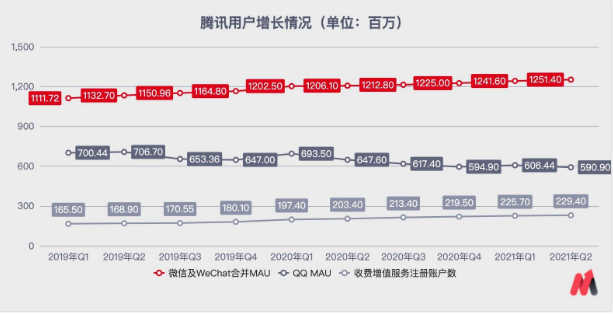 截至2021年6月30日,微信(含WeChat)月活用户达12.51亿,同比增长3.8%;QQ移动终端月活5.909亿,同比减少8.8%;收费增值服务账户数同比增长12.8%至2.29亿。视频付费服务会员数同比增长9%至1.25亿(与Q1持平);音乐付费服务会员数同比增长41%至6600万(比Q1增加500万)。