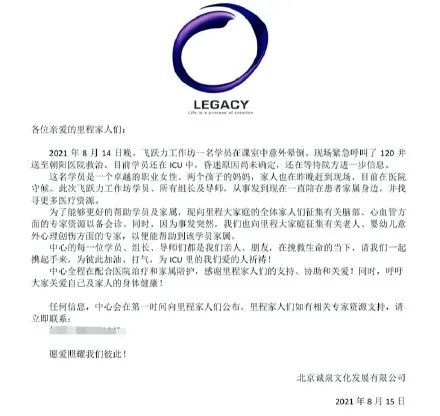 公告称,14日,她曾晕倒在一个名为“里程 LEGACY ”的机构开设的心灵探索课中,随后被送往ICU。