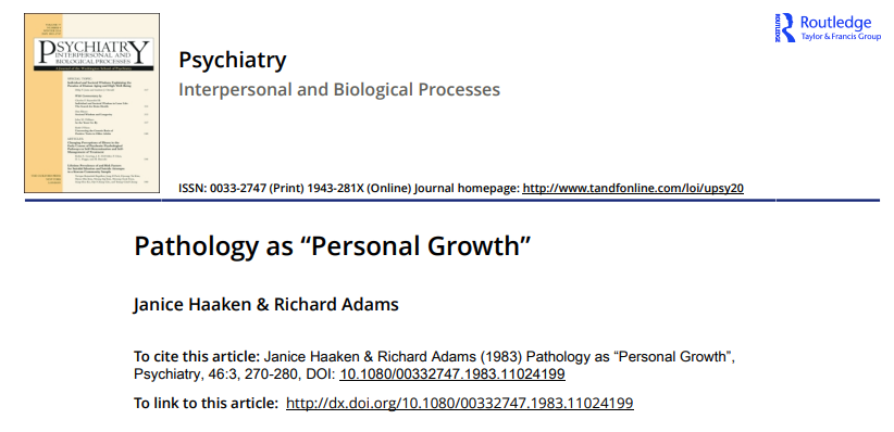 [4]Janice Haaken & Richard Adams (1983) Pathology as “Personal Growth”, Psychiatry, 46:3, 270-280, DOI: 10.1080/00332747.1983.11024199