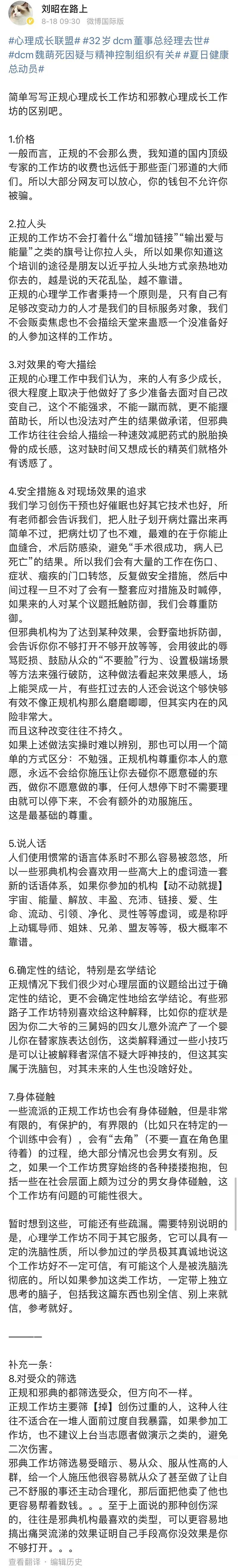 “课程中夹杂很多心理学相关的理论和活动环节,但老师和机构并没有心理学相关的资格。部分同学参加活动过程中以及课程后精神崩溃,留下心理创伤。”(@界面)