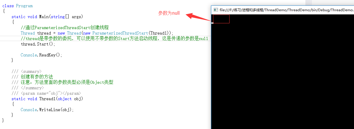 注意:ParameterizedThreadStart委托的参数类型必须是Object的。如果使用的是不带参数的委托,不能使用带参数的Start方法运行线程,否则系统会抛出异常。但使用带参数的委托,可以使用thread.Start()来运行线程,这时所传递的参数值为null。