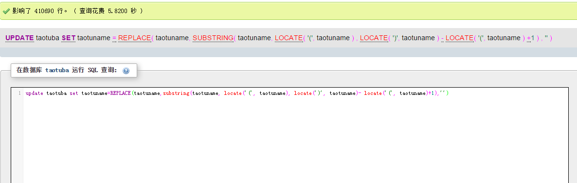update taotuba set taotuname=REPLACE(taotuname,substring(taotuname, locate('(', taotuname), locate(')', taotuname)- locate('(', taotuname)+1),'')