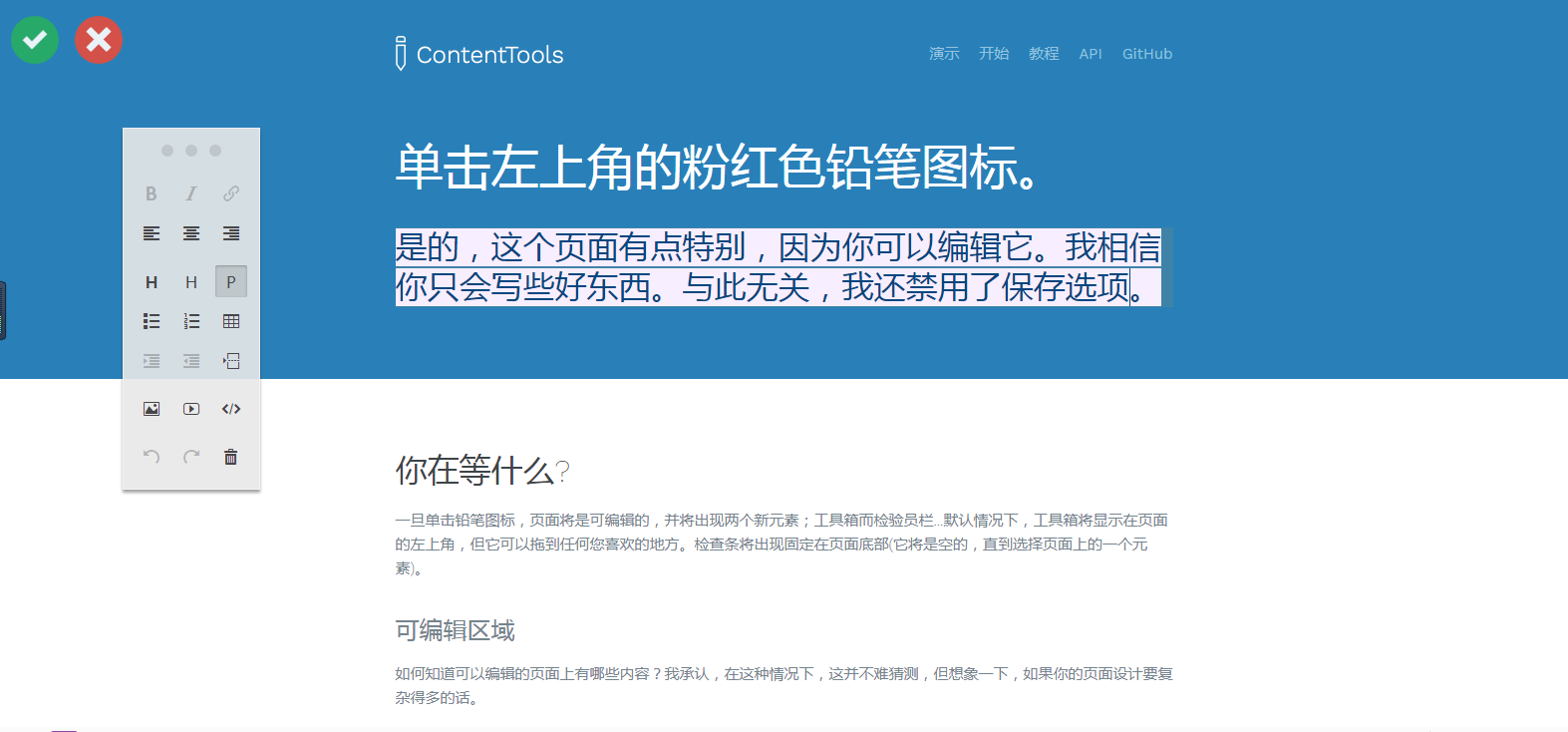 今天在头条上看到推送的这个ContentTools文章,一眼就相中了它。可视化前端编辑插件ContentTools所见即所得,看起来是我想要的效果,下面一起看看这款JavaScript插件是怎么使用的吧!