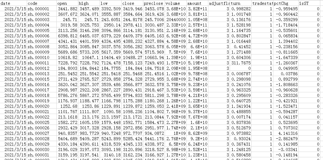 import baostock as bsimport pandas as pdclass test: def __init__(self): self.data_list=[] self.rs=None def get(self,gpd): rs = bs.query_history_k_data_plus(gpd[0],"date,code,open,high,low,close,preclose,volume,amount,adjustflag,turn,tradestatus,pctChg,isST",start_date='2021-03-15', end_date='2021-03-16',frequency="d", adjustflag="3") while (rs.error_code == '0') & rs.next(): self.data_list.append(rs.get_row_data()) print(rs.get_row_data()) self.rs=rsif __name__ == "__main__": lg = bs.login() rs = bs.query_all_stock(day="2021-03-15") te=test() i=0 while (rs.error_code == '0') & rs.next(): i=i+1 print(i) gpd=rs.get_row_data() te.get(gpd) result = pd.DataFrame(te.data_list, columns=te.rs.fields) result.to_csv("C://Users//Administrator//Desktop//gp//all.csv", index=False) bs.logout()上面的代码获取了2021年3月15日的所有参与交易的股票数据,想要别的日期数据,可以自行修改日期。
