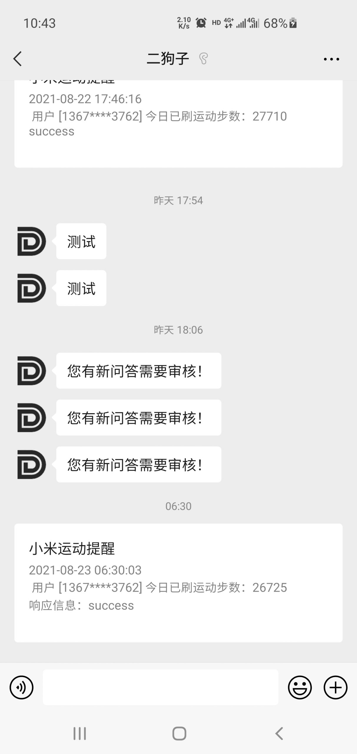 #!/usr/bin/env python # -*- coding: utf-8 -*- # !/usr/bin/env python # coding:utf-8 # file wechat.py import time import requests import json import flask,requests from flask_cors import * class WeChat: def __init__(self): self.CORPID = '你的企业ID' self.CORPSECRET = '你的应用Secret' self.AGENTID = '你的应用AgentId' self.TOUSER = "daimadog" # 接收者用户名 def _get_access_token(self): url = 'https://qyapi.weixin.qq.com/cgi-bin/gettoken' values = {'corpid': self.CORPID, 'corpsecret': self.CORPSECRET, } req = requests.post(url, params=values) data = json.loads(req.text) # print data return data["access_token"] def get_access_token(self): try: with open('./tmp/access_token.conf', 'r') as f: t, access_token = f.read().split() except: with open('./tmp/access_token.conf', 'w') as f: access_token = self._get_access_token() cur_time = time.time() f.write('/t'.join([str(cur_time), access_token])) return access_token else: cur_time = time.time() if 0 < cur_time - float(t) < 7260: return access_token else: with open('./access_token.conf', 'w') as f: access_token = self._get_access_token() f.write('/t'.join([str(cur_time), access_token])) return access_token def send_data_text(self, message): #msg = message.encode('utf-8') send_url = 'https://qyapi.weixin.qq.com/cgi-bin/message/send?access_token=' + self.get_access_token() send_values = { "touser": self.TOUSER, "msgtype": "text", "agentid": self.AGENTID, "text": { "content": message }, "safe": "0" } send_msges=(bytes(json.dumps(send_values), 'utf-8')) respone = requests.post(send_url, send_msges) respone = respone.json() #当返回的数据是json串的时候直接用.json即可将respone转换成字典 return respone["errmsg"]